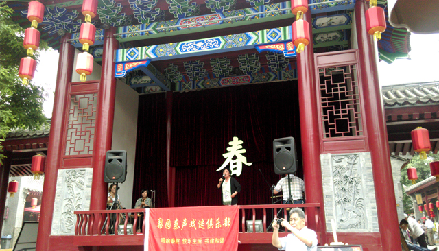 2015年5月16日,陕西梨园秦声戏迷会受邀来到永兴坊,为广大戏迷朋友们带来了《三滴血》、《卖水》、《五典坡》、《斩秦英》等优秀唱段。戏迷朋友们坐在戏台前方的遮阳区,品着茶水,听着秦腔,凉风习习,手拿折扇。是何等的惬意。